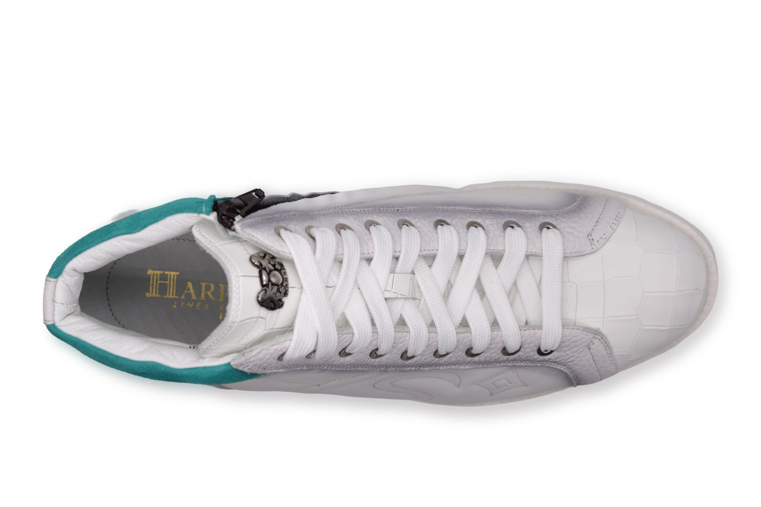 Soft white leather ankle boots with shaded details and inserts in fine Tiffany-coloured Writer suede. A bright sneaker, enriched with nickel accessories for a clean and modern design.