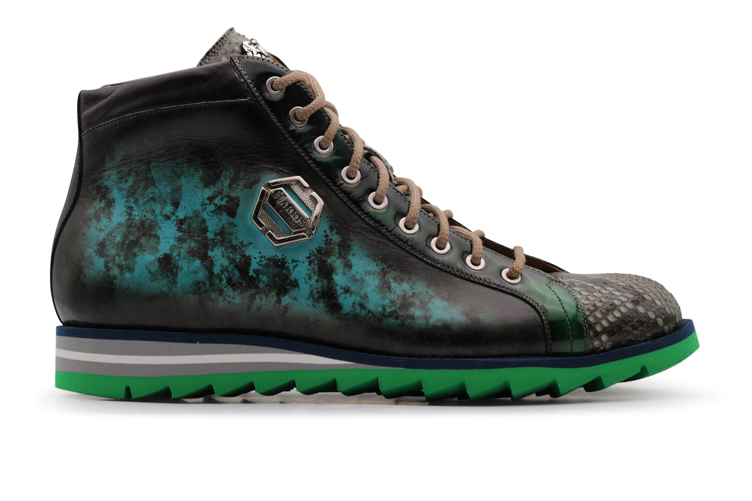 This Harris polarino combines the elegance of the real python skin with the decisive character of the printed crocodile effect printed skin, expertly painted and shaded by hand.
