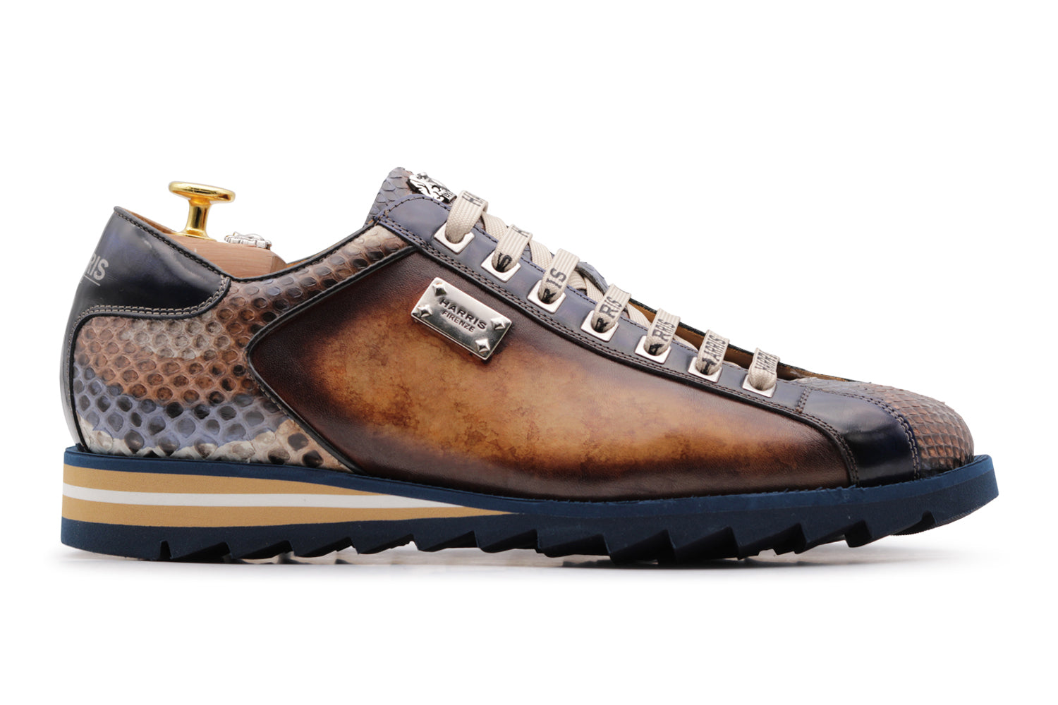 Questa Sneaker Unisce Pelle di vitello pieno fiore e vera pelle di pitone pro un effetto sfumato unico. Die Details der gebürsteten Leder verbessern das Design, während das Accessoires im Nickel -Finish eine moderne Note verleiht. Die Runner -Gummi -Sohle und die Blake Rapid -Verarbeitung vervollständigen das Modell, indem sie Komfort und Widerstand bietet.