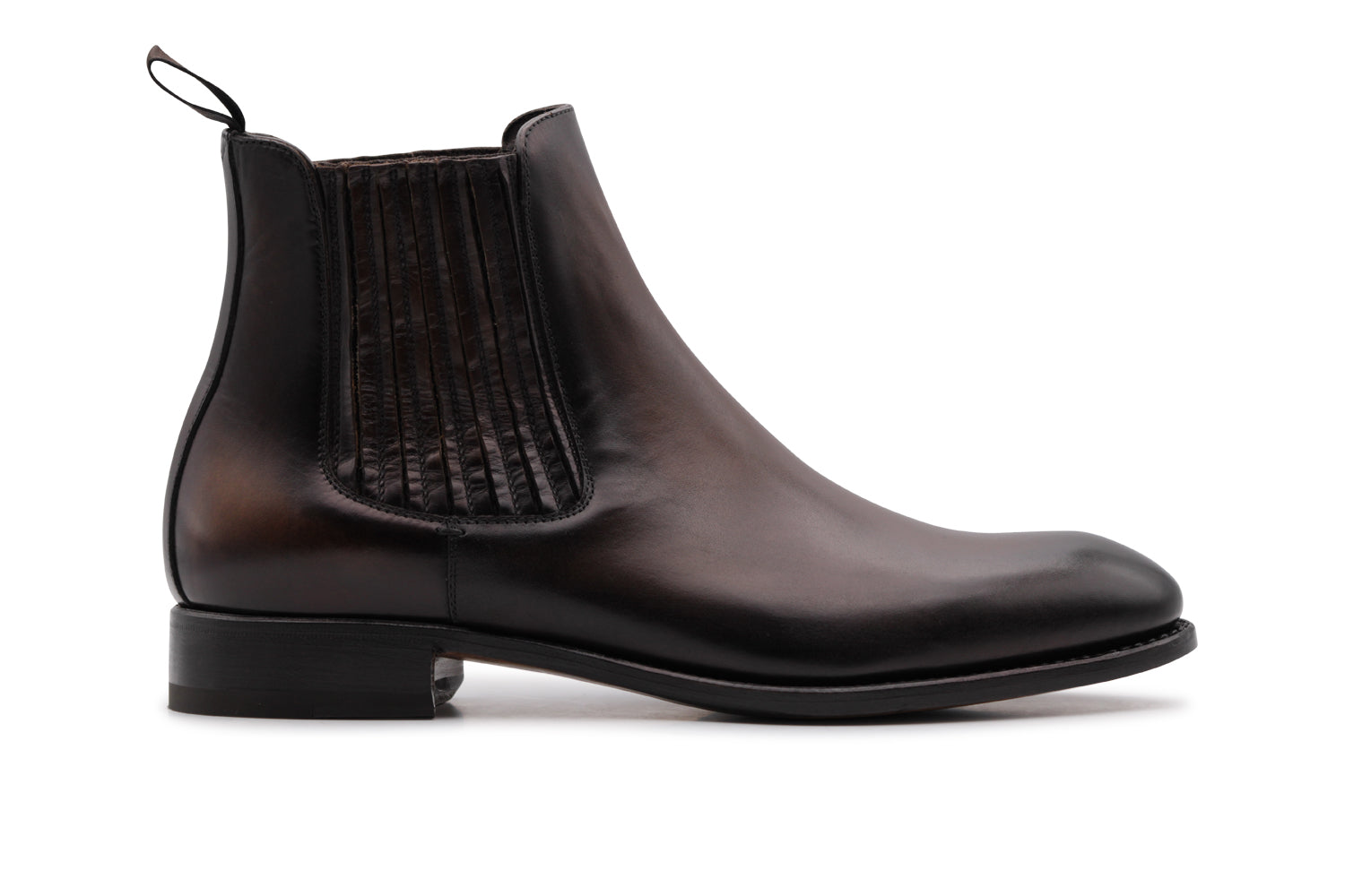 Ein zeitloser Klassiker, neu interpretiert von Harris: glattes, vollnarbiges Kalbsleder, seitlicher Gummizug, genähter Rahmen und Gummisohle. Die Blake Rapid-Konstruktion sorgt für eine perfekte Kombination aus Widerstandsfähigkeit und Flexibilität.