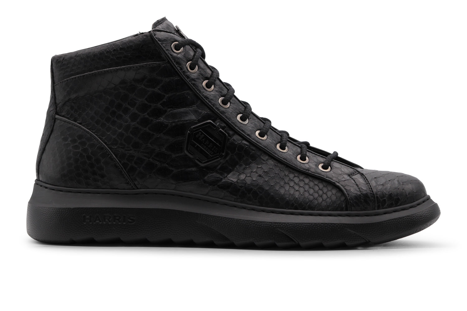 Die Registerkarte in echtem Python -Leder, gebürsteten Lederdetails und Nickel -Harris -Accessoires vervollständigen das Design mit Eleganz.