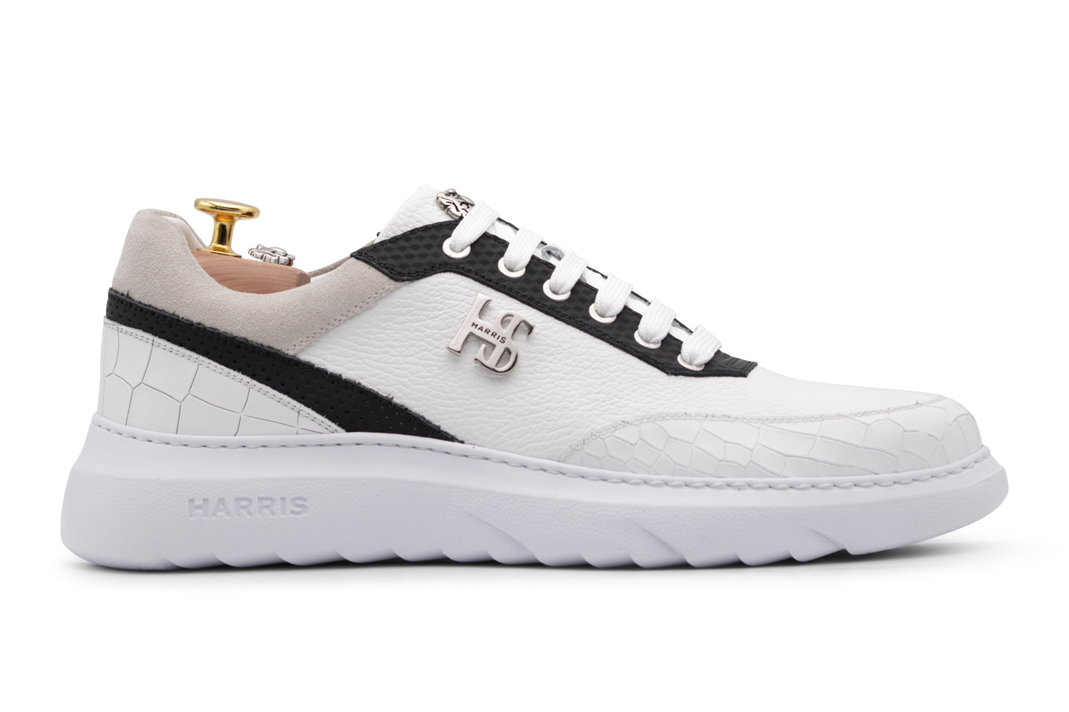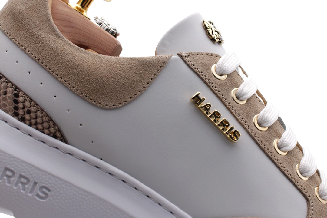 Dieser aus wertvolle Materialien hergestellte Sneaker kombiniert die Kostbarkeit der beigen Python -Haut mit der Weichheit des beigen Wildleders und erzeugt einen eleganten Kontrast. Die Einsätze in voller weißer Blume verleihen dem Design Helligkeit und Harmonie. Die White Innovation Sohle sorgt für überlegene Flexibilität und Komfort, während Goldzubehör und die Harris -Thrombozyten das Modell mit unverwechselbaren Details verschönern. Die natürliche Auskleidung garantiert eine tadellose Anpassung.