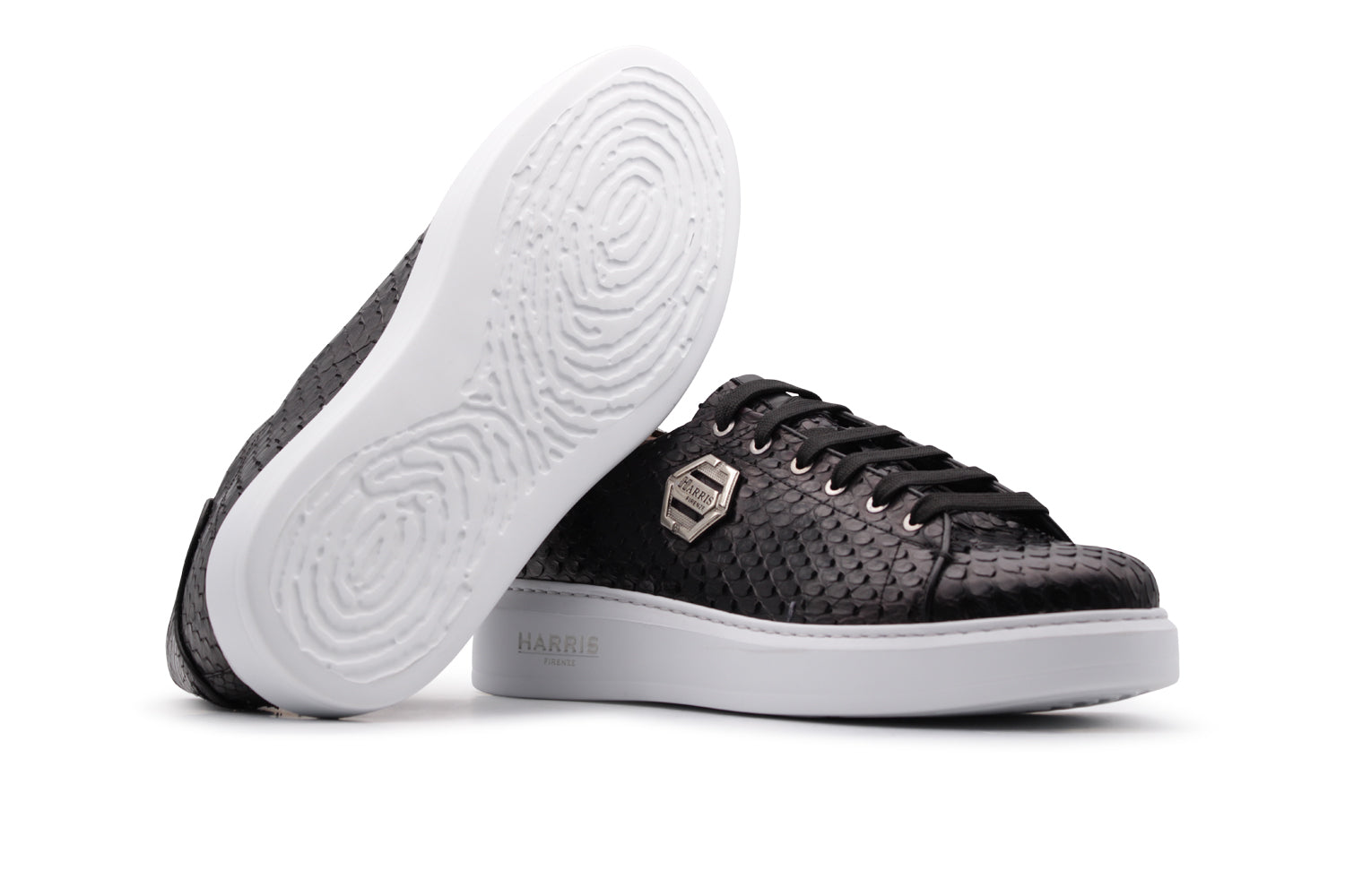Realizzata in vera pelle di pitone nera, questa sneaker unisce l’essenza del lusso alla naturale versatilità dello stile urbano. La texture del pitone è arricchita dagli accessori in nichel, che creano un equilibrio tra lucentezza e profondità. A completare il deisgn la suola in gomma a cassetta per assicurare comfort duraturo.