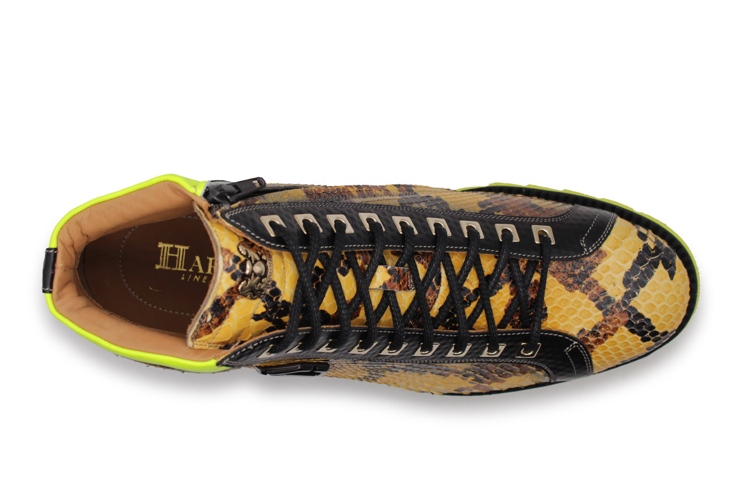Stiefeletten aus echtem gelben Pythonleder, angereichert mit schwarzen Einsätzen aus gebürstetem Leder und fluoreszierenden gelben Akzenten. Die schwarz-goldenen Accessoires unterstreichen den aggressiven und luxuriösen Charakter dieses Modells.