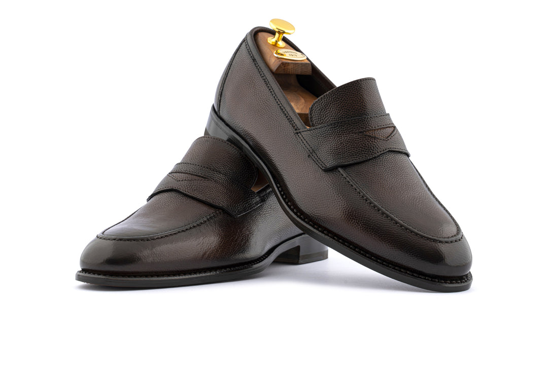 Mocassino in pelle pieno fiore stampata chicco di riso, lavorato a mano in un profondo marrone scuro con leggere sfumature di colore che simboleggiano la finitura artigianale mentre il passante in pelle aggiunge un tocco classico e discreto. Realizzato con lavorazione Blake Rapid è completato da una suola in cuoio con inserto antiscivolo che conferisce carattere, eleganza e comfort.
