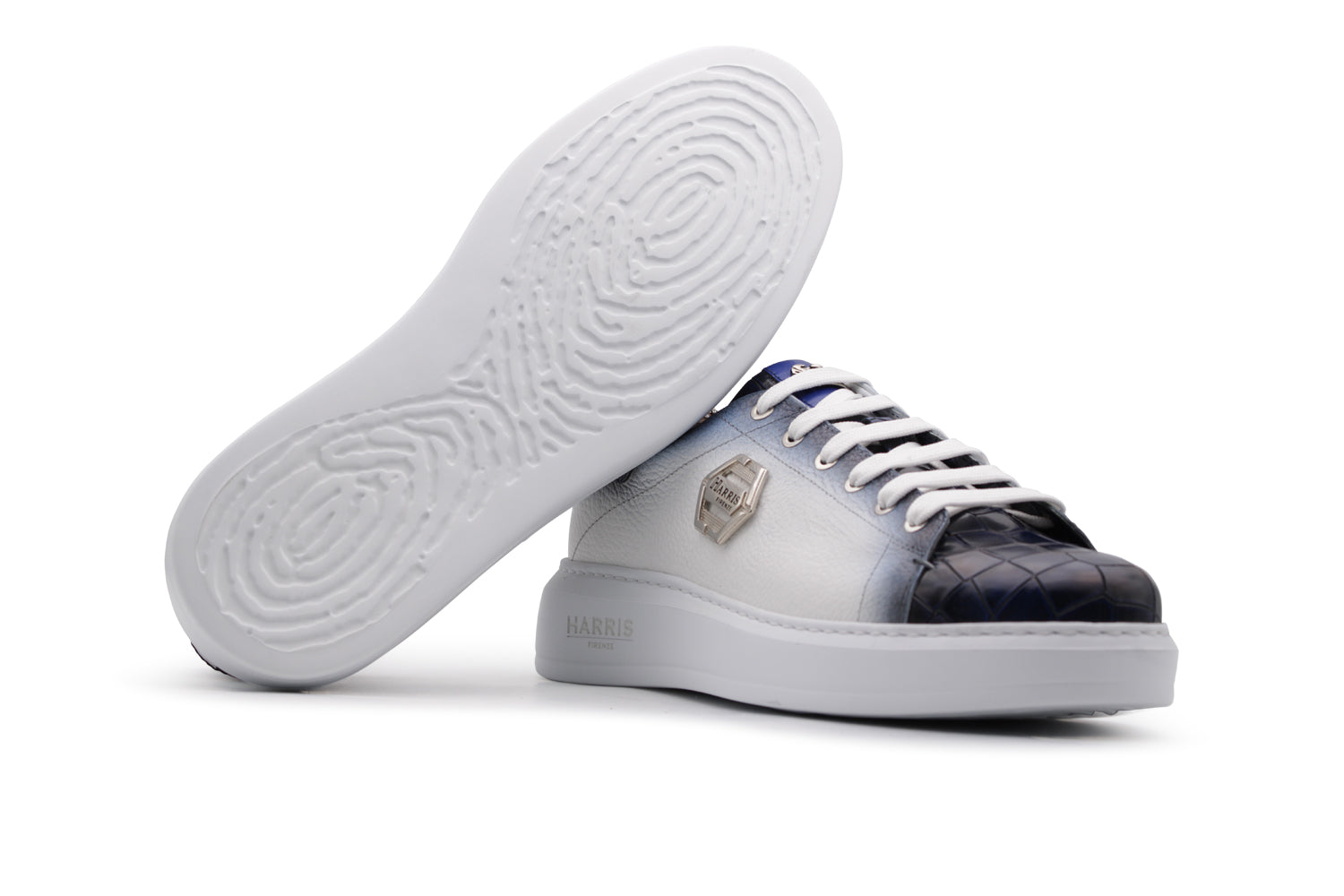 Sneaker in pelle morbida effetto alce, sfumata a mano per esaltarne la profondità dei toni. I riporti in pelle stampata effetto coccodrillo creano un raffinato gioco di texture che racconta cura e carattere. Completano il modello gli accessori in nichel e la suola in gomma a cassetta, per un equilibrio perfetto tra artigianalità, comfort e stile contemporaneo.