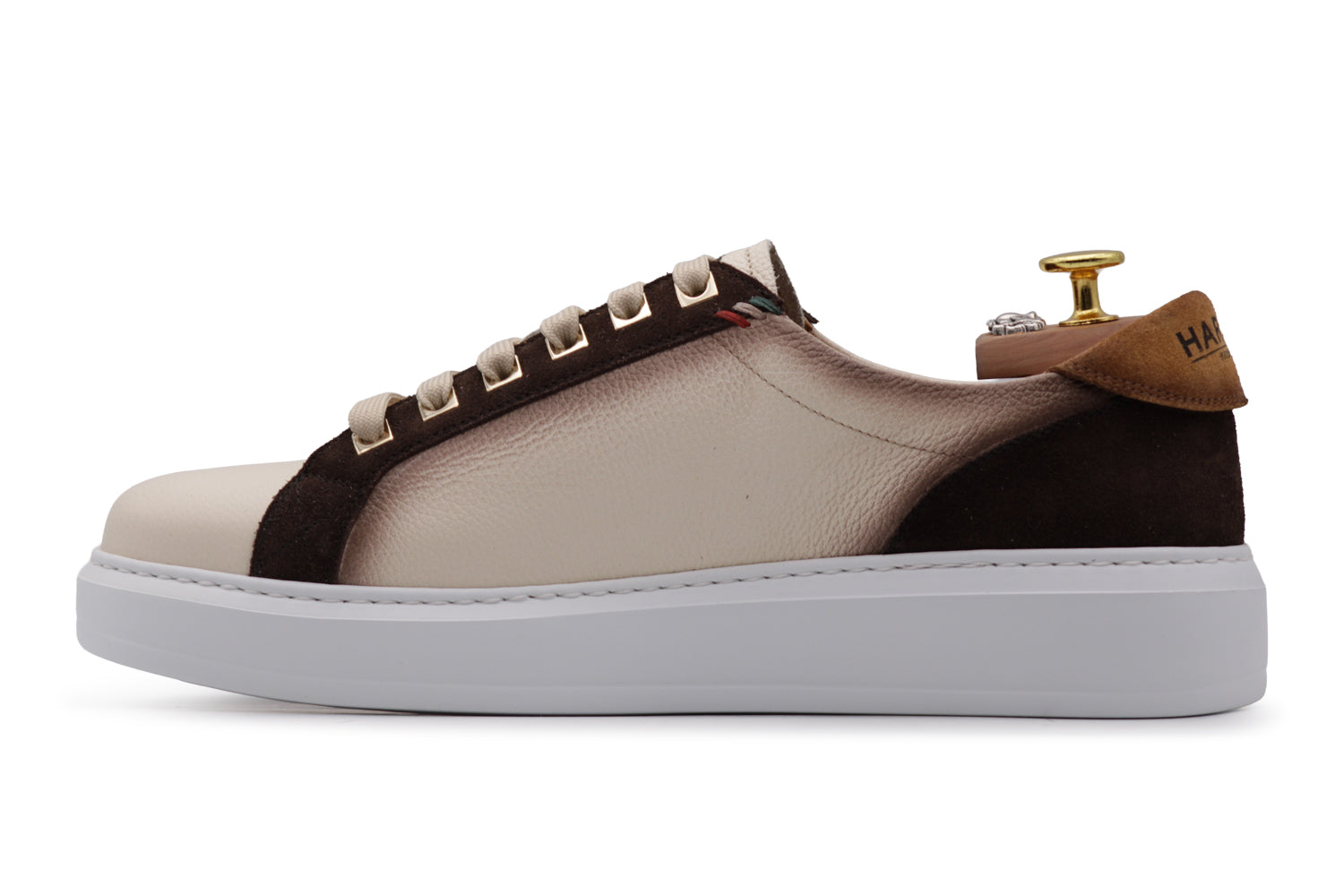Estas zapatillas deportivas de piel suave con efecto de alce están adornadas con pantallas hechas a mano y detalles de ante. La suela cassette blanca y la construcción Blake Rapid garantizan una pisada ligera y una estructura sólida, fiel al ADN de Harris.
