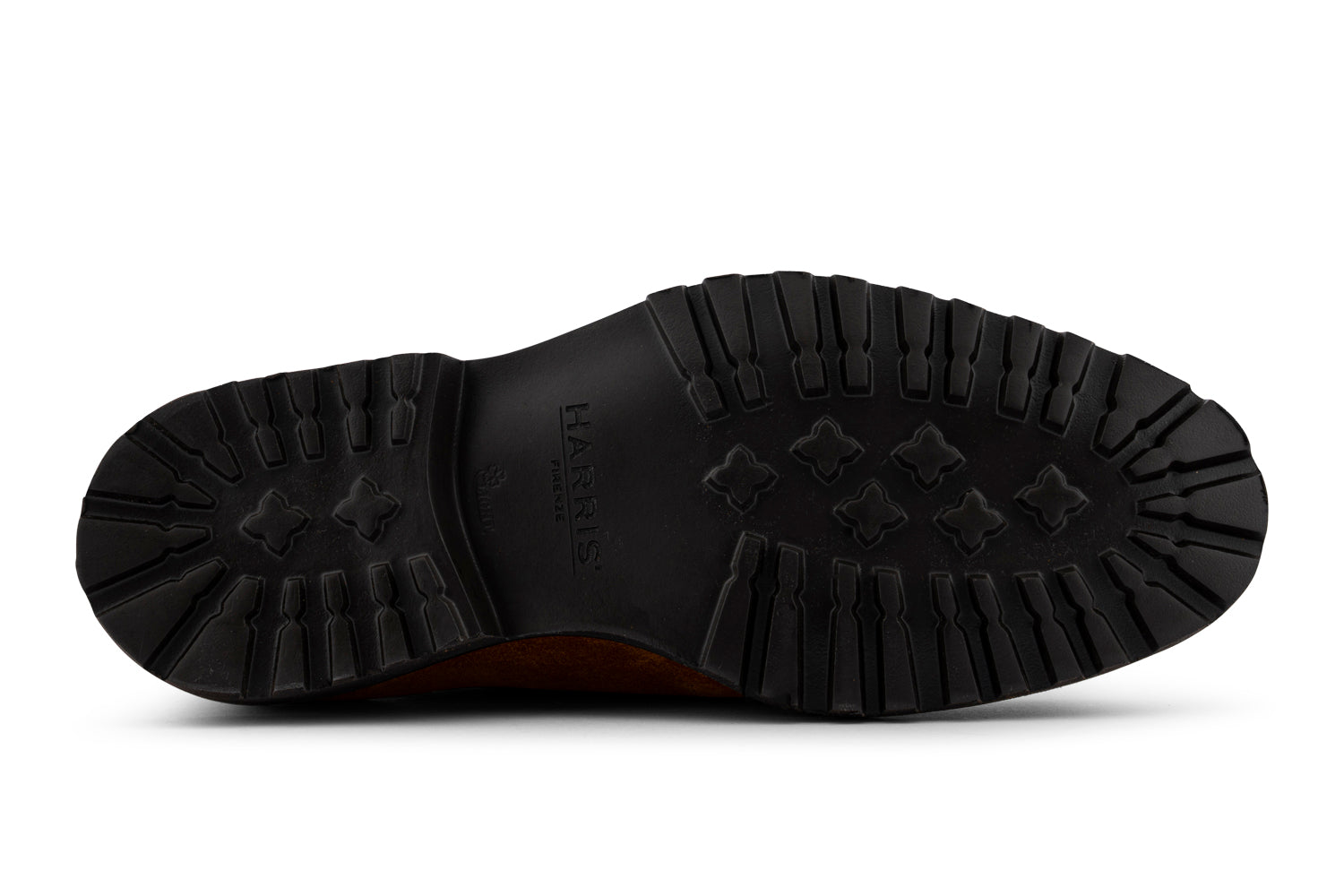 Una obra maestra de la artesanía italiana. Piel serraje color coñac con tonos marrón oscuro, cosidos a mano y suela de goma con tacos. La fabricación Blake Rapid aporta resistencia y comodidad a un zapato con auténtico encanto.