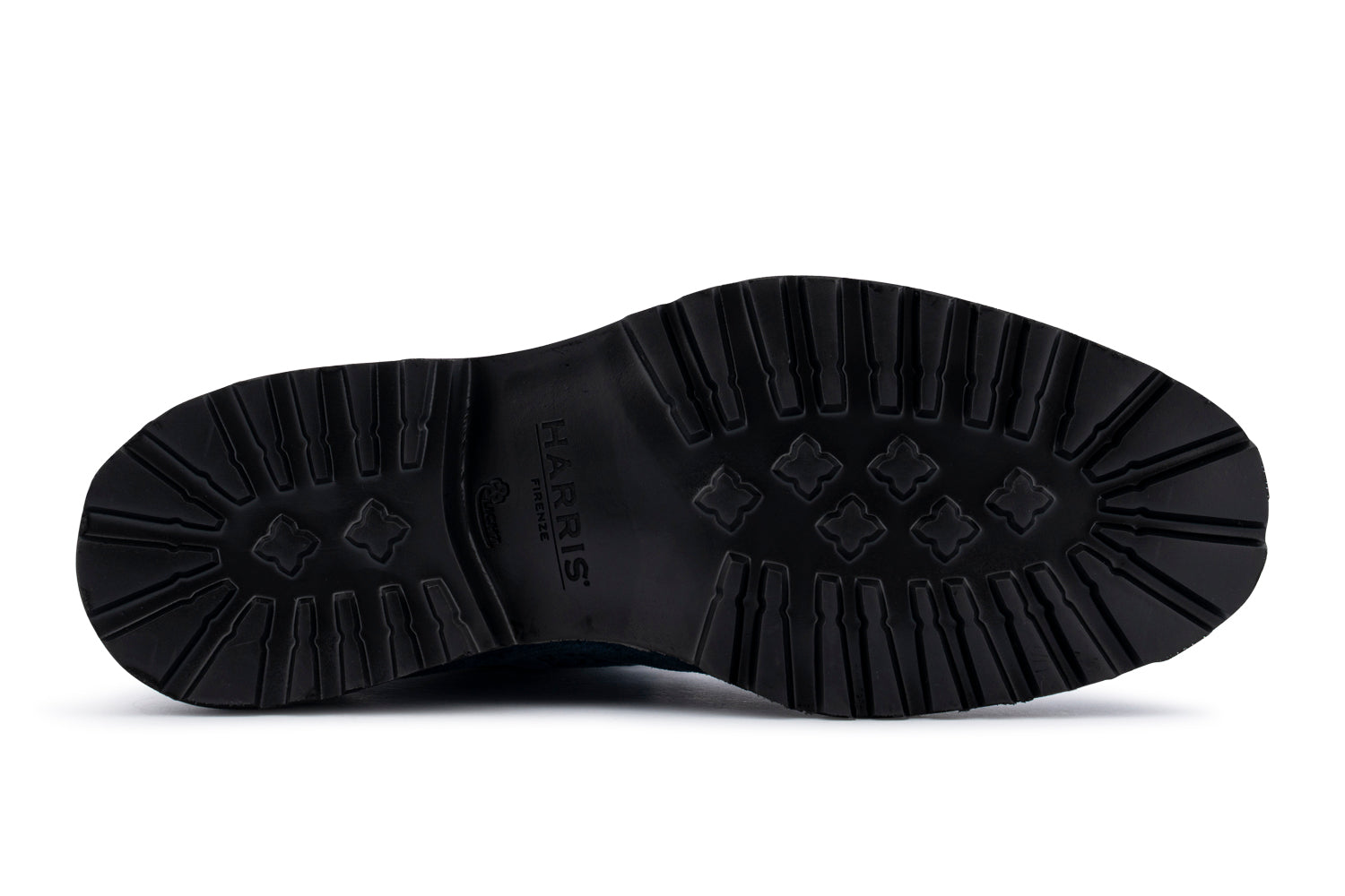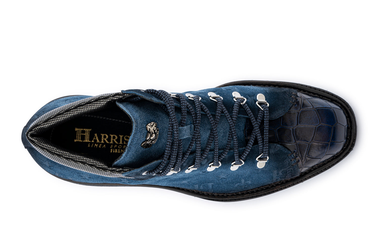 Polacchino made of suede leather with Harris Monogram -shaped Harris printing enhanced by the coccodrillo effect smooth leather tongue and metallic details. The padded neck guarantees comfort, while the nickel accessories and the tires in tires complete the design giving firm character.