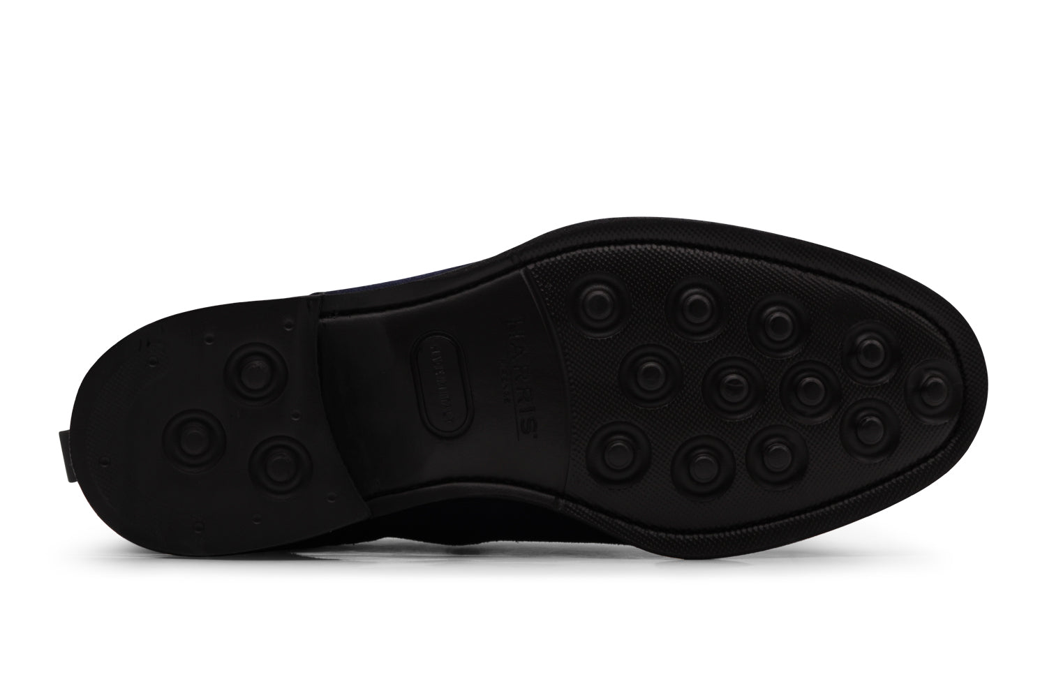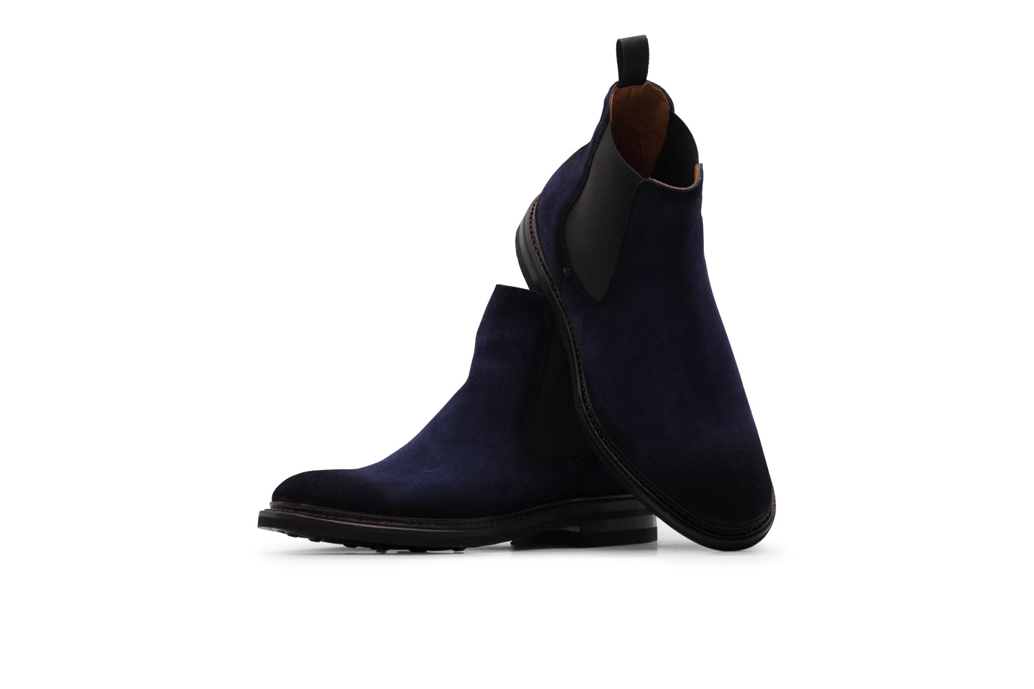 Ankle boot in dark blue suede leather, embellished with handmade shades. The side elastic enhances its practicality, while the Dainite rubber sole and Blake Rapid manufacturing guarantee comfort and durability over time.