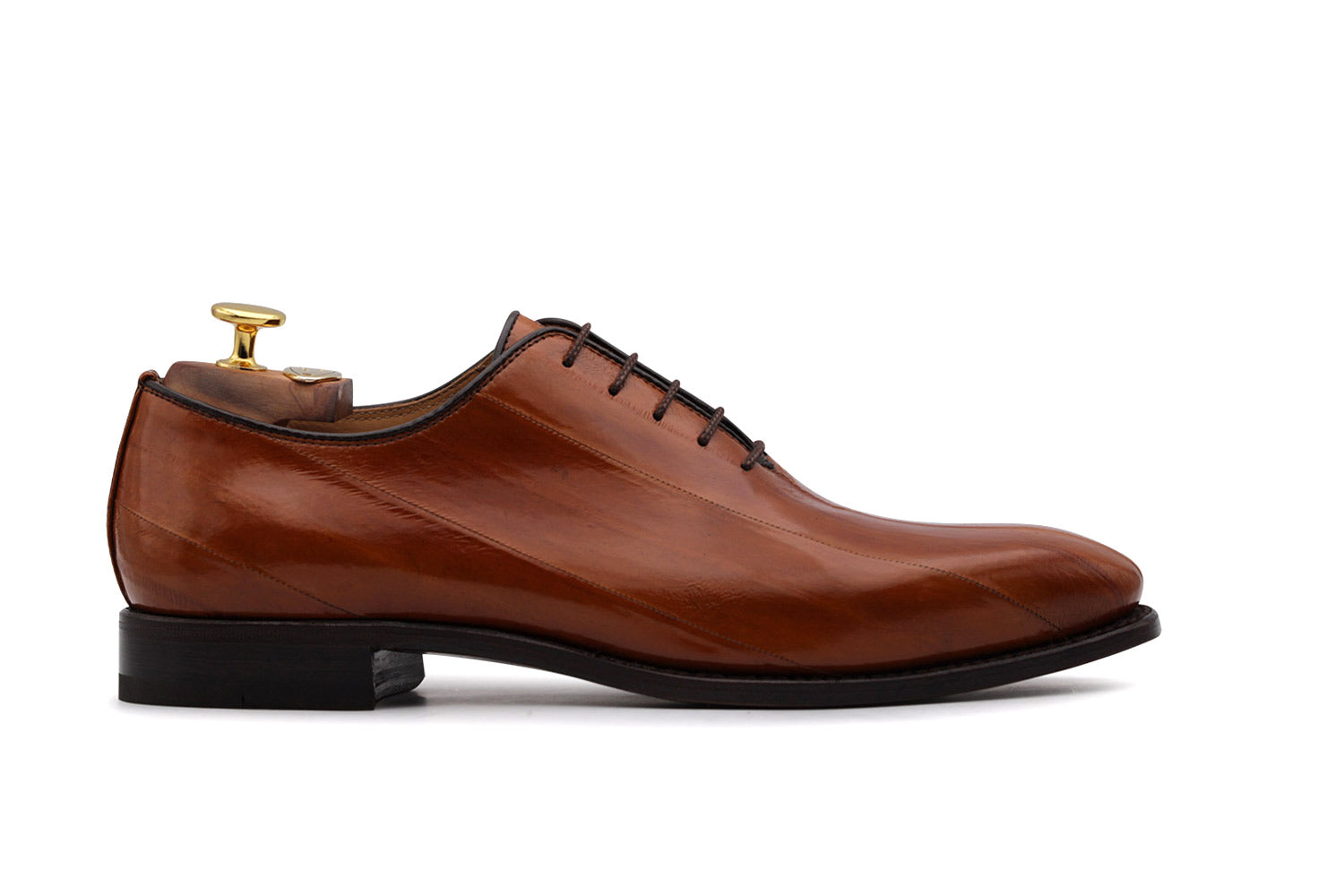 Solide en cuir anguilla avec semelle en cuir. Le haut, présente des coutures décoratives qui expriment sa ligne élégante et raffinée. Main finie avec un brillant naturel.