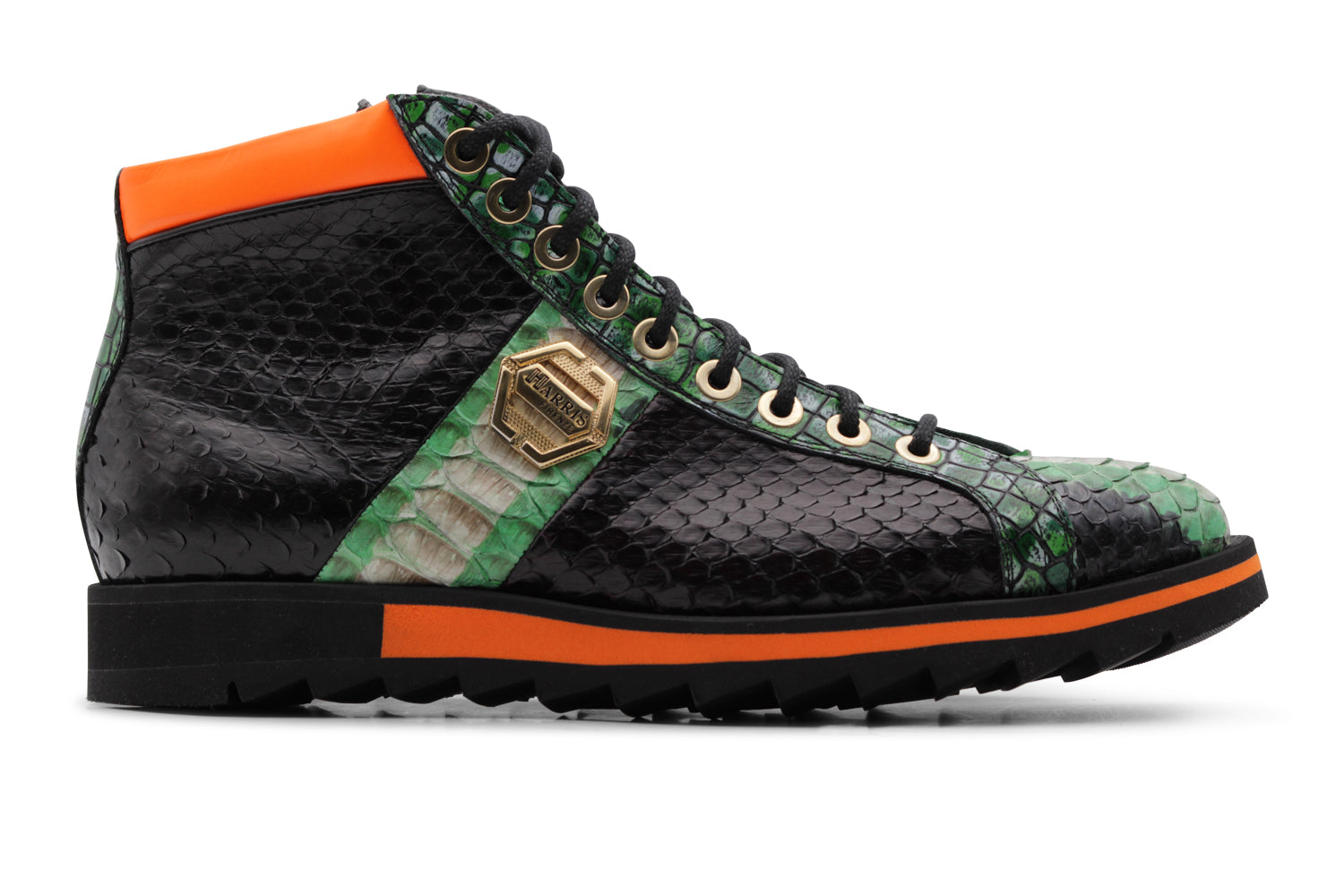 Polacchino rocciatore in pelle di vitello pieno fiore stampata effetto coccodrillo, dipinta a mano e arricchita da dettagli anticati. La chiusura con occhielli e ganci in oro antico, il laccio in pelle con fibbia coordinata e la suola carrarmato color tortora conferiscono un forte carattere tecnico e raffinato. Lavorazione norvegese per una struttura robusta e un’estetica ricercata.