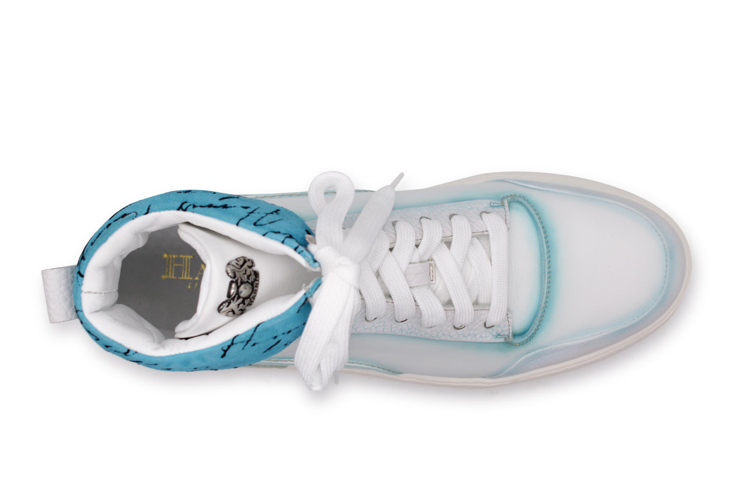 Morbidezza e freschezza si fondono in questa creazione in vitello sfumato a mano. I dettagli in suede writer si accendono con sfumature celeste, offrendo una variante moderna e luminosa alla classica suola in gomma a cassetta.