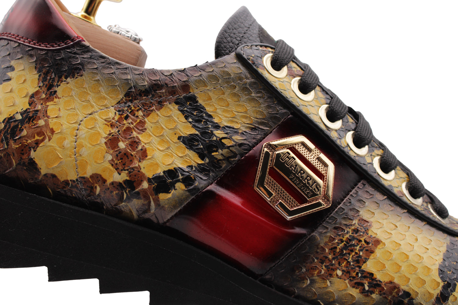 Questa sneaker combina il pregiato pitone giallo con riporti in pelle spazzolata rossa sfumata. Gli accessori in oro e la suola runner nera creano un contrasto cromatico dinamico e lussuoso.