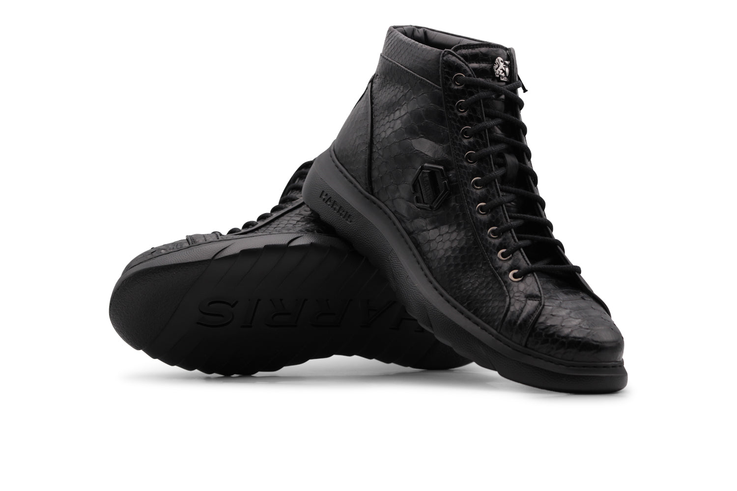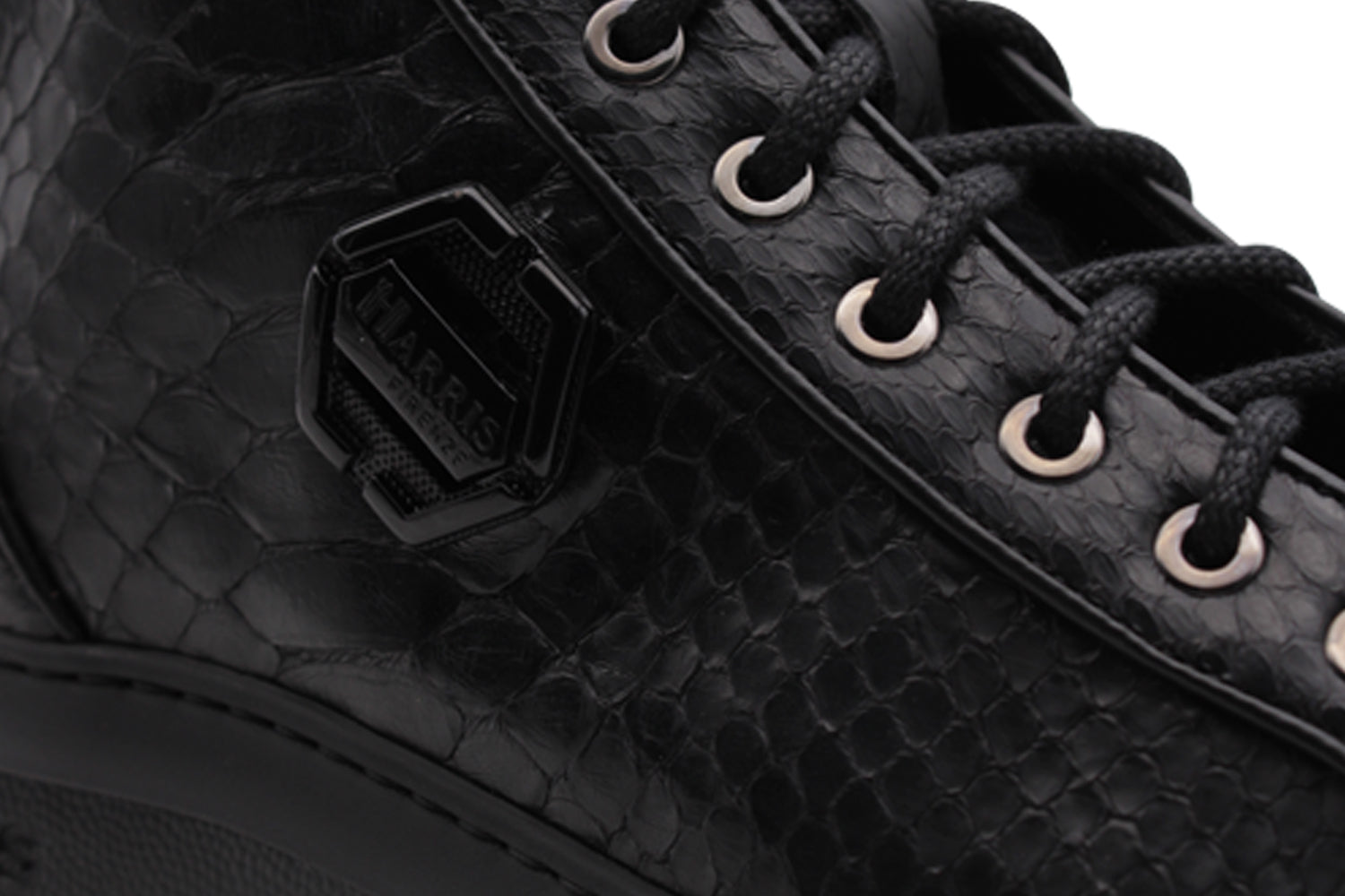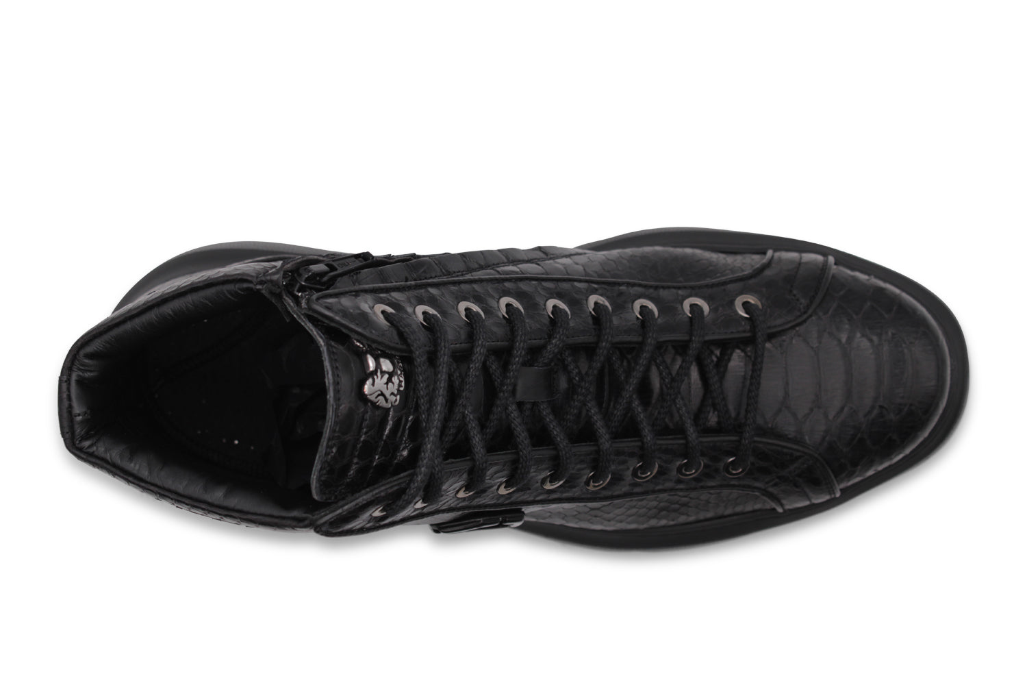 Simbolo di artigianalità e stile contemporaneo, questo polacchino in pelle di pitone nero combina materiali pregiati e dettagli esclusivi. La suola in gomma Innovazione garantisce comfort quotidiano, mentre gli accessori nichel e il logo in metallo nero aggiungono un tocco di eleganza discreta e ricercata.
