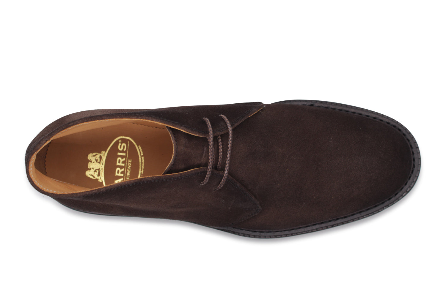 Pelle di suede nera con guardolo cucito e suola in gomma Dainite, frutto della tradizionale lavorazione Blake Rapid. Essenziale, versatile, contemporaneo: un modello Harris che coniuga sobrietà e carattere.
