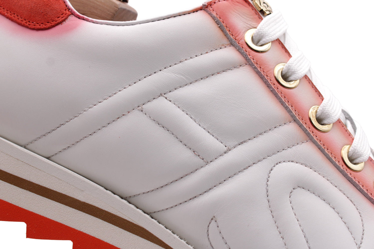 Sneaker in vitello pieno fiore bianco, accesa da dettagli in suede color arancio sfumato. L'allacciatura lavorata a mano completa un look fresco ed estivo.