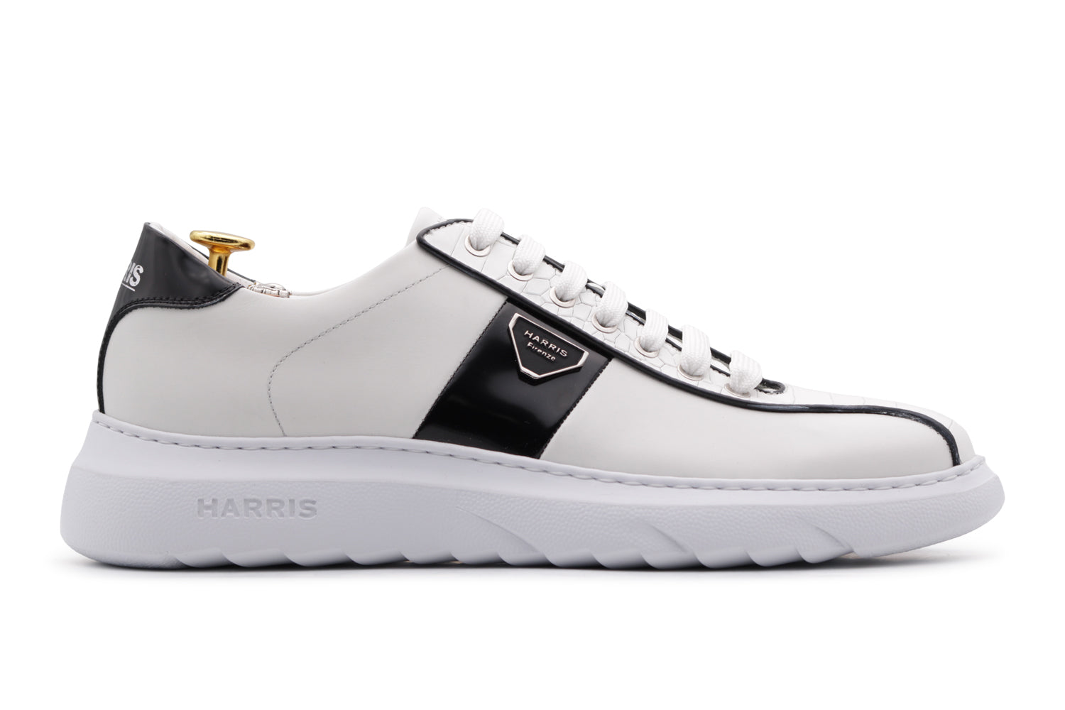 I dettagli rossi donano carattere e contrasto, mentre la suola in gomma a cassetta Innovazione garantisce comfort e stile contemporaneo. Completano la calzatura l’inconfondibile accessorio Harris, simbolo di eccellenza e artigianalità italiana.