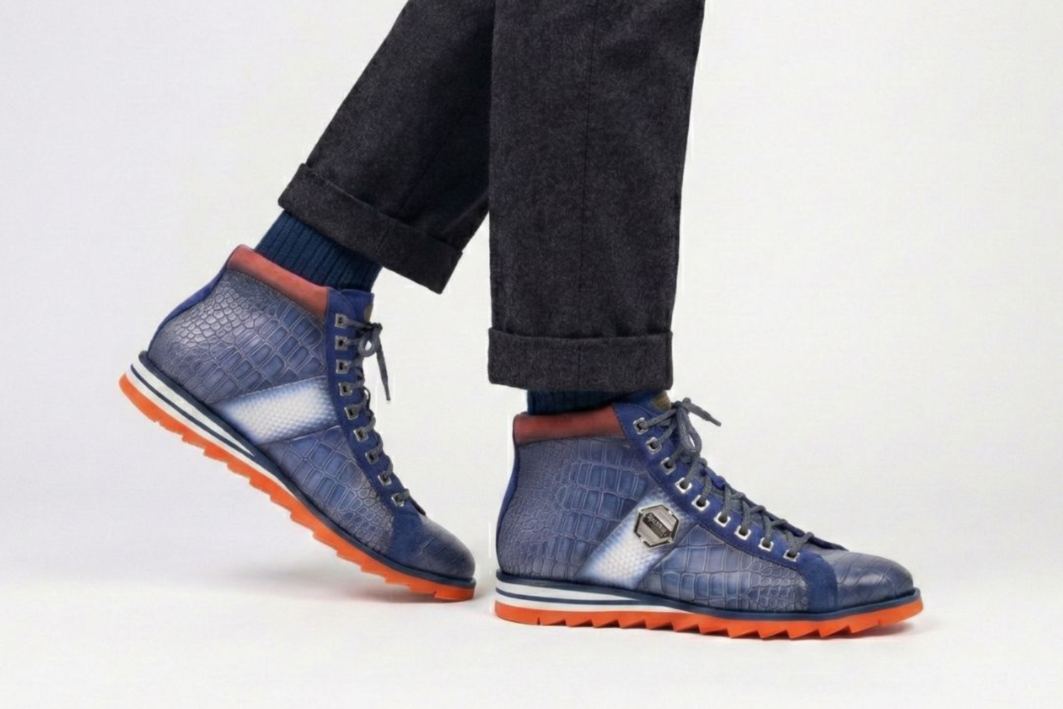 La base in vitello spazzolato stampa coccodrillo si arricchisce di dettagli: allacciatura, linguetta e tallone sono realizzati in pelle scamosciata sfumata a mano, creando un gioco di texture irresistibile. Accessori nichel per un look fresco e moderno.