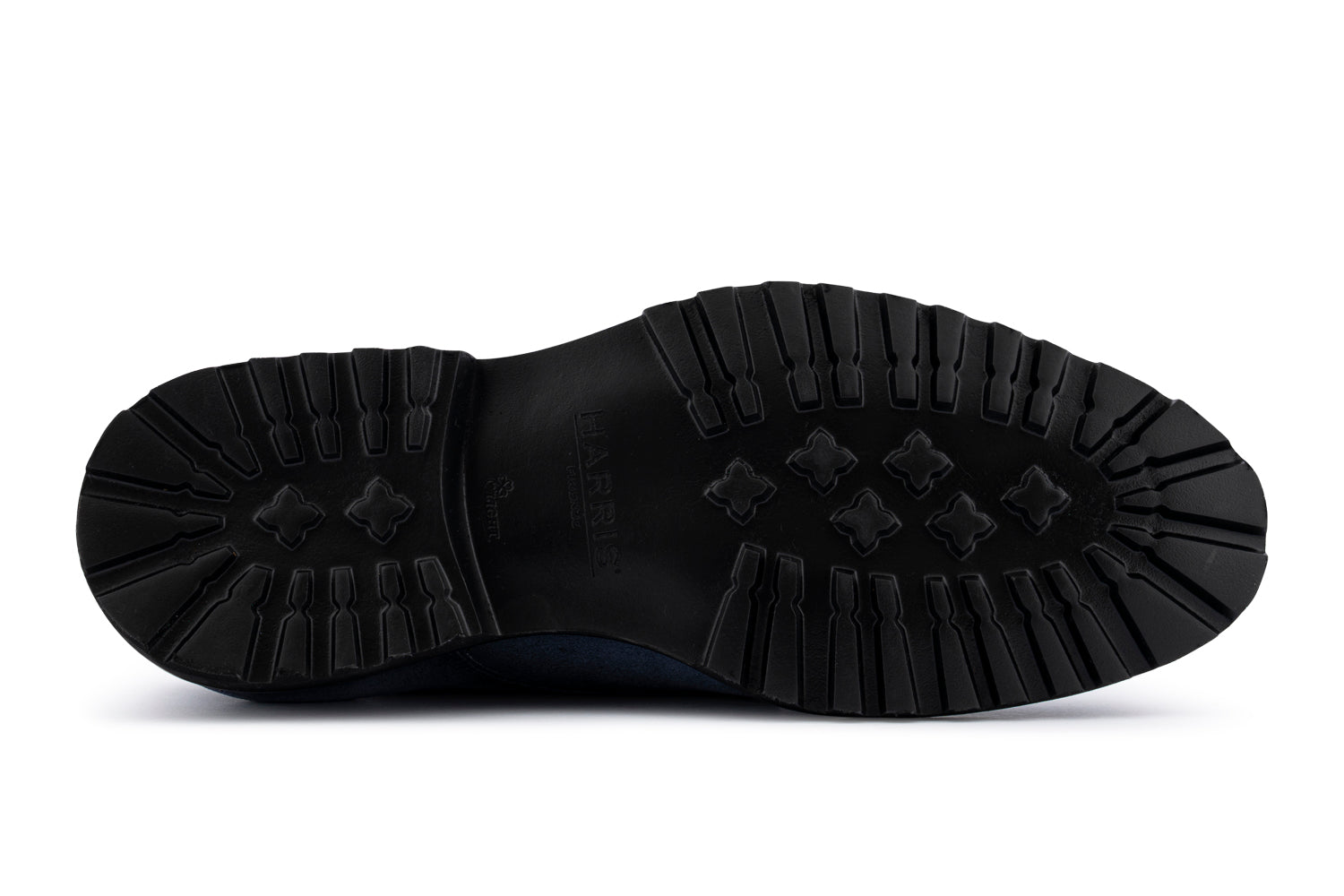 Doppia fibbia in camoscio sfumato a mano in delicata tonalità azzurra, espressione di uno stile raffinato e contemporaneo. La cucitura sul bordo evidenzia la precisione della manifattura artigianale mentre la suola in gomma carrarmato con guardolo cucito dona carattere e solidità senza rinunciare all’eleganza.
