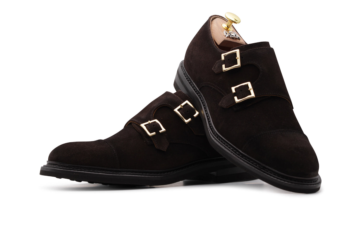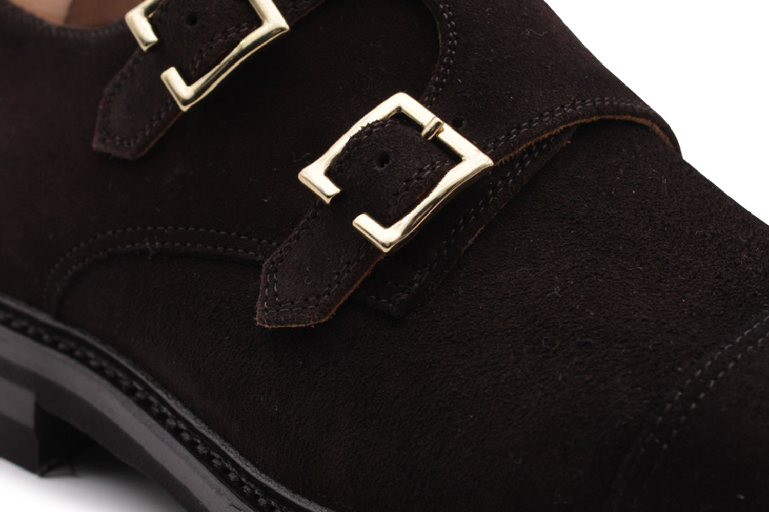 Questa doppia fibbia in pelle scamosciata color testa di moro, con sfumature scure realizzate a mano, esprime un’eleganza decisa e contemporanea. Le fibbie quadrate in finitura oro completano il design, mentre la suola in gomma con guardolo cucito assicura comfort e qualità artigianale Made in Italy.