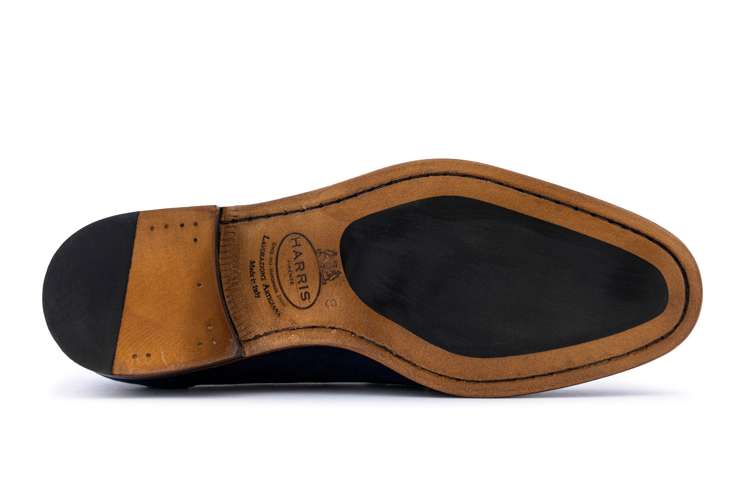 Pelle scamosciata blu scuro con pon pon a contrasto in suede blu chiaro. Sfumata a mano e montata su suola in cuoio leggero con inserto in gomma, è un esempio di stile dinamico e costruzione Blake Rapid.