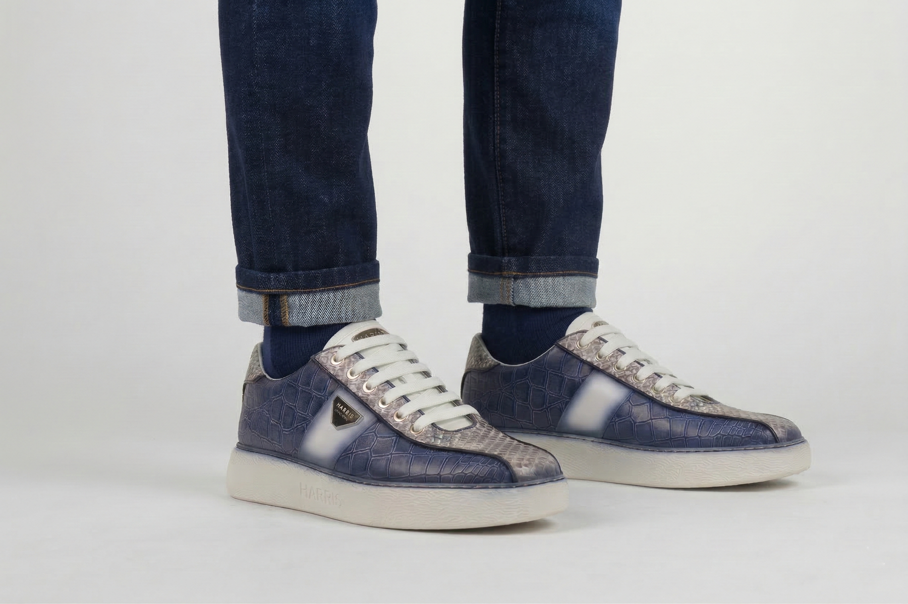 The strong character of the crocodile print brushed leather meets the exclusivity of the real Roccia python inserts. Characterized by shaded white details that illuminate the profile, this shoe rests on a rubber cassette sole, defining a new standard of urban luxury and material audacity.